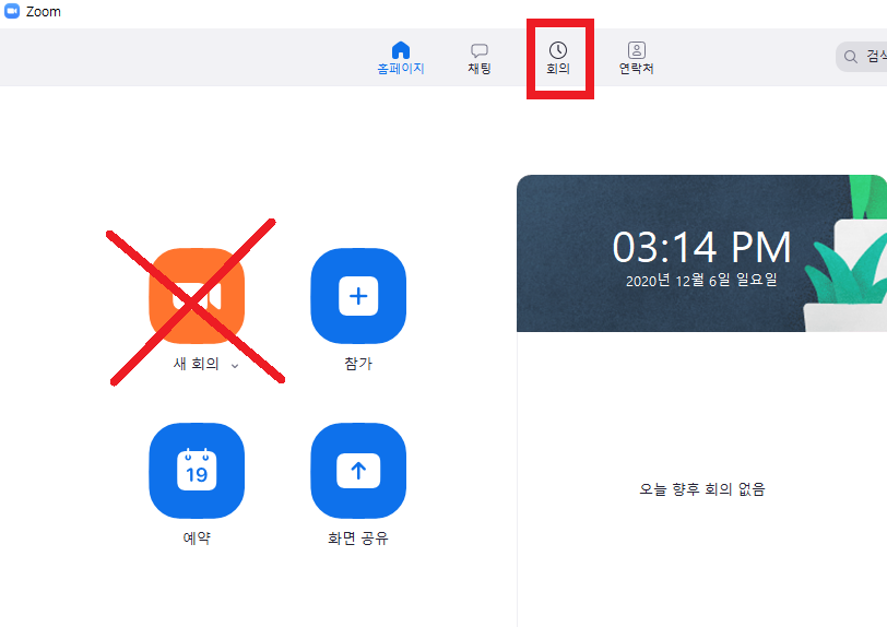 1. 줌 어플 실행- 맨 아래 '회의'탭 클릭